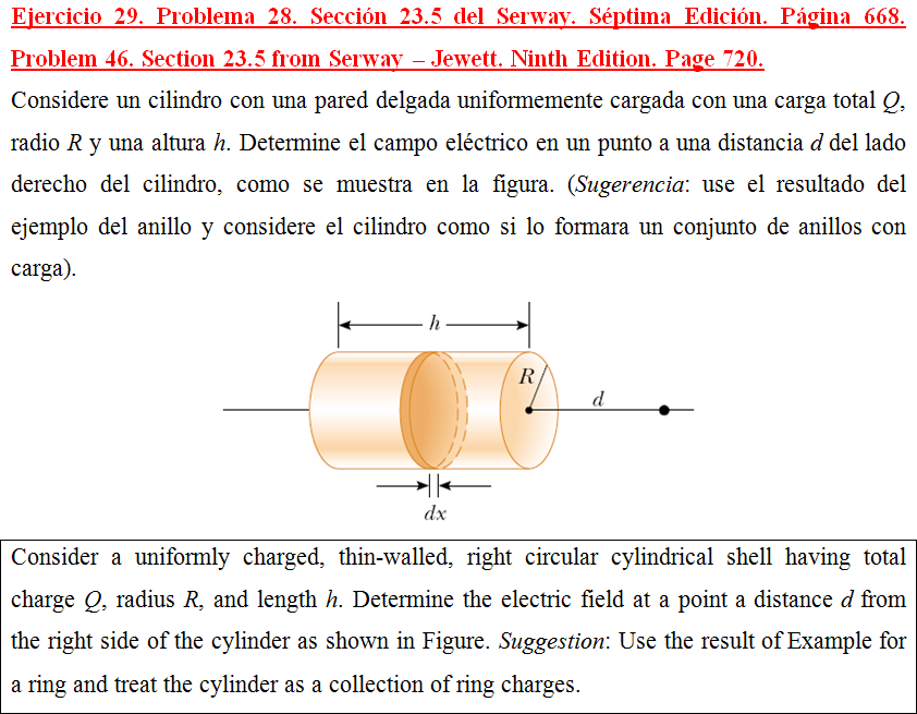 Considere un cilindro con una pared delgada uniformemente cargada con una carga total Q, radio R y una altura h. Determine el campo eléctrico en un punto a una distancia d del lado derecho del cilindro, como se muestra en la figura. (Sugerencia: use el resultado del ejemplo del anillo y considere el cilindro como si lo formara un conjunto de anillos con carga).