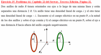 Dos anillos de radio R tienen orientados sus ejes a lo largo de una misma línea y están separados una distancia 2 R. Un anillo tiene una densidad lineal de carga λ y el otro tiene una densidad lineal de carga – λ. Encuentre a) el campo eléctrico en un punto P1 a la mitad de los dos anillos y sobre el eje común y b) el campo eléctrico en un punto P2 sobre el eje a una distancia R hacia afuera del anillo cargado negativamente.