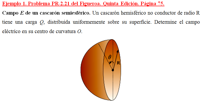 Campo E de un cascarón semiesférico. Un cascarón hemisférico no conductor de radio R tiene una carga Q, distribuida uniformemente sobre su superficie. Determine el campo eléctrico en su centro de curvatura O.