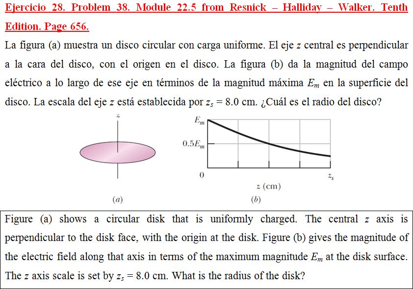 La figura (a) muestra un disco circular con carga uniforme. El eje z central es perpendicular a la cara del disco, con el origen en el disco. La figura (b) da la magnitud del campo eléctrico a lo largo de ese eje en términos de la magnitud máxima Em en la superficie del disco. La escala del eje z está establecida por zs = 8.0 cm. ¿Cuál es el radio del disco?