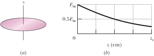 Figure (a) shows a circular disk that is uniformly charged. The central z axis is perpendicular to the disk face, with the origin at the disk. Figure (b) gives the magnitude of the electric field along that axis in terms of the maximum magnitude Em at the disk surface. The z axis scale is set by zs = 8.0 cm. What is the radius of the disk?
