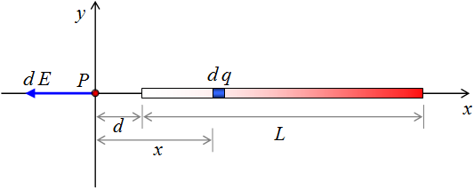 Se considera un elemento diferencial de carga (d q) sobre la barra a una distancia x con respecto al eje y. La influencia que ejerce dicho elemento sobre la carga de prueba colocada en el origen es de repulsión, con un diferencial de campo eléctrico d E (orientado hacia la parte negativa del eje x).