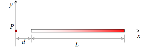 Barra con carga no uniforme. Una línea de carga de longitud L y orientada a lo largo del eje x como en la figura tiene una carga por unidad de longitud que varía como \( \displaystyle \lambda = \frac{\lambda_0\,(x-d)}{d}\), donde d es la distancia de la barra al origen (punto P en la figura) y λ0 una constante. Encuentre el campo eléctrico en el origen. (Sugerencia: un elemento infinitesimal tiene una carga d q = λ d x, pero observe que λ no es una constante.)