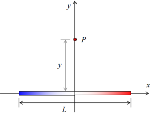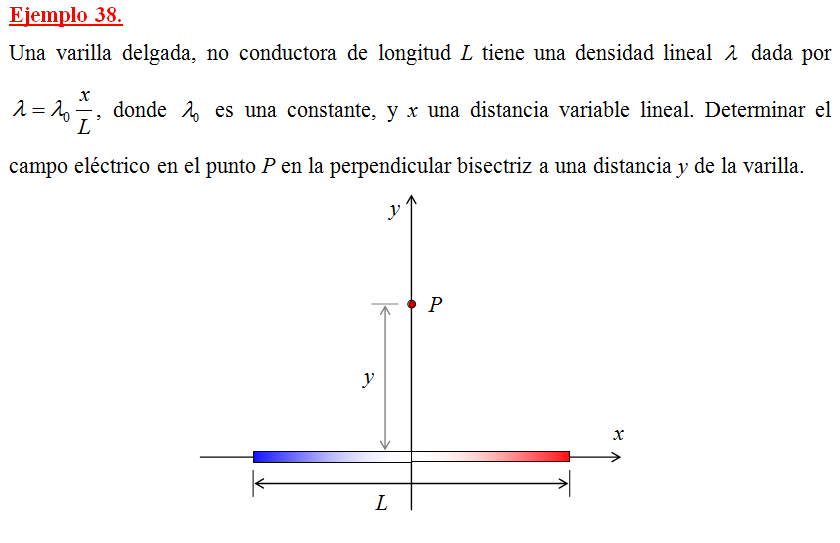 , donde es una constante, y x una distancia variable lineal. Determinar el campo eléctrico en el punto P en la perpendicular bisectriz a una distancia y de la varilla.