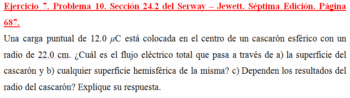 Una carga puntual de 12.0 μC está colocada en el centro de un cascarón esférico con un radio de 22.0 cm. ¿Cuál es el flujo eléctrico total que pasa a través de a) la superficie del cascarón y b) cualquier superficie hemisférica de la misma? c) Dependen los resultados del radio del cascarón? Explique su respuesta.