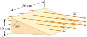 Imagine una caja triangular cerrada en reposo en un campo eléctrico horizontal con una magnitud de E = 7.80×104 N/C, como se muestra en la figura. Calcule el flujo eléctrico a través de a) la superficie rectangular vertical, b) la superficie inclinada, c) la superficie total de la caja.