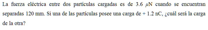 La fuerza eléctrica entre dos partículas cargadas es de 3.6 μN cuando se encuentran separadas 120 mm. Si una de las partículas posee una carga de +1.2 nC, ¿cuál será la carga de la otra?