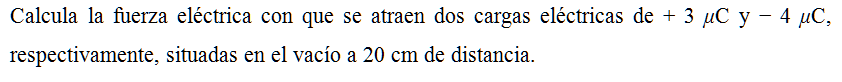 Calcula la fuerza eléctrica con que se atraen dos cargas eléctricas de + 3 μC y − 4 μC, respectivamente, situadas en el vacío a 20 cm de distancia.