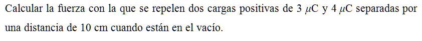 Calcular la fuerza con la que se repelen dos cargas positivas de 3 μC y 4 μC separadas por una distancia de 10 cm cuando están en el vacío.