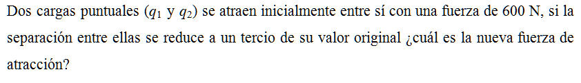 Dos cargas puntuales (q1 y q2) se atraen inicialmente entre sí con una fuerza de 600 N, si la separación entre ellas se reduce a un tercio de su valor original ¿cuál es la nueva fuerza de atracción?