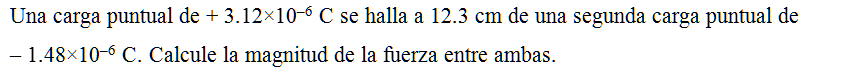 Una carga puntual de + 3.12×10–6 C se halla a 12.3 cm de una segunda carga puntual de – 1.48×10–6 C. Calcule la magnitud de la fuerza entre ambas.