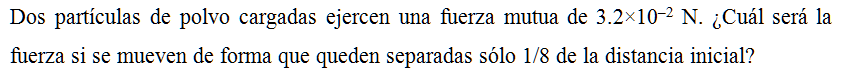 Dos  partículas de polvo cargadas ejercen una fuerza mutua de 3.2×10–2 N. ¿Cuál será la fuerza si se mueven de forma que queden separadas sólo 1/8 de la distancia inicial?