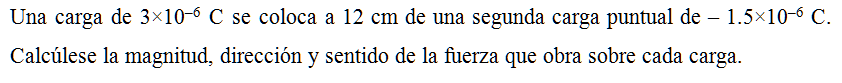 Una carga de 3×10–6 C se coloca a 12 cm de una segunda carga puntual de –1.5×10–6 C. Calcúlese la magnitud, dirección y sentido de la fuerza que obra sobre cada carga.