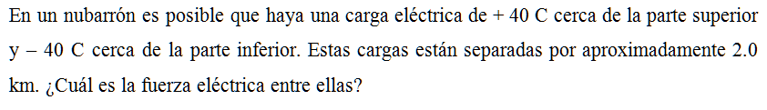 En un nubarrón es posible que haya una carga eléctrica de +40 C cerca de la parte superior y –40 C cerca de la parte inferior. Estas cargas están separadas por aproximadamente 2.0 km. ¿Cuál es la fuerza eléctrica entre ellas?