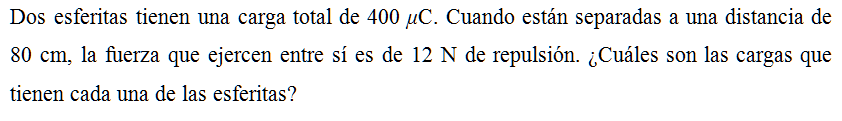 Dos esferitas tienen una carga total de 400 μC. Cuando están separadas a una distancia de 80 cm, la fuerza que ejercen entre sí es de 12 N de repulsión. ¿Cuáles son las cargas que tienen cada una de las esferitas?