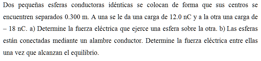 Dos pequeñas esferas conductoras idénticas se colocan de forma que sus centros se encuentren separados 0.300 m. A una se le da una carga de 12.0 nC y a la otra una carga de –18 nC. a) Determine la fuerza eléctrica que ejerce una esfera sobre la otra. b) Las esferas están conectadas mediante un alambre conductor. Determine la fuerza eléctrica entre ellas una vez que alcanzan el equilibrio.