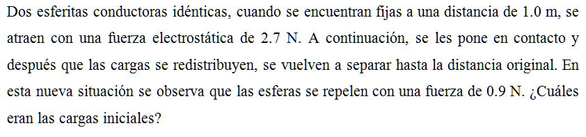 Dos esferitas conductoras idénticas, cuando se encuentran fijas a una distancia de 1.0 m, se atraen con una fuerza electrostática de 2.7 N. A continuación, se les pone en contacto y después que las cargas se redistribuyen, se vuelven a separar hasta la distancia original. En esta nueva situación se observa que las esferas se repelen con una fuerza de 0.9 N. ¿Cuáles eran las cargas iniciales?