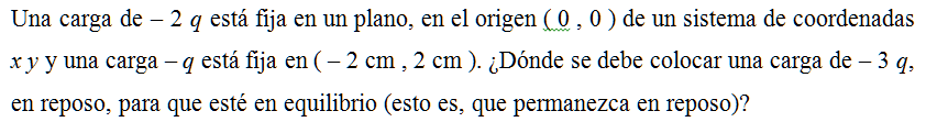 Una carga de – 2 q está fija en un plano, en el origen ( 0 , 0 ) de un sistema de coordenadas x y y una carga – q está fija en ( – 2 cm , 2 cm ). ¿Dónde se debe colocar una carga de – 3 q, en reposo, para que esté en equilibrio (esto es, que permanezca en reposo)?