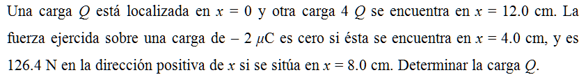 Una carga Q está localizada en x = 0 y otra carga 4 Q se encuentra en x = 12.0 cm. La fuerza ejercida sobre una carga de – 2 μC es cero si ésta se encuentra en x = 4.0 cm, y es 126.4 N en la dirección positiva de x si se sitúa en x = 8.0 cm. Determinar la carga Q.