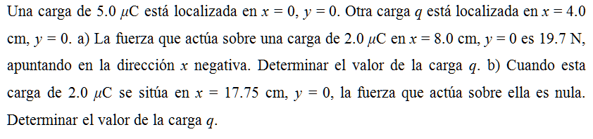 Una carga de 5.0 μC está localizada en x = 0, y = 0. Otra carga q está localizada en x = 4.0 cm, y = 0. a) La fuerza que actúa sobre una carga de 2.0 μC en x = 8.0 cm, y = 0 es 19.7 N, apuntando en la dirección x negativa. Determinar el valor de la carga q. b) Cuando esta carga de 2.0 μC se sitúa en x = 17.75 cm, y = 0, la fuerza que actúa sobre ella es nula. Determinar el valor de la carga q.