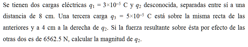 Se tienen dos cargas eléctricas q1 = 3×10–5 C y q2 desconocida, separadas entre sí a una distancia de 8 cm. Una tercera carga q3 = 5×10–5 C está sobre la misma recta de las anteriores y a 4 cm a la derecha de q2. Si la fuerza resultante sobre ésta por efecto de las otras dos es de 6562.5 N, calcular la magnitud de q2.
