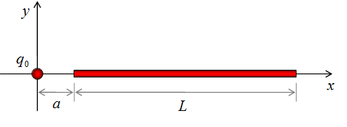 A rod of length L has a uniform positive charge per unit length λ and a total charge Q. Calculate the electric force on a point charge q0 at a point P that is located along the long axis of the rod and a distance a from one end.