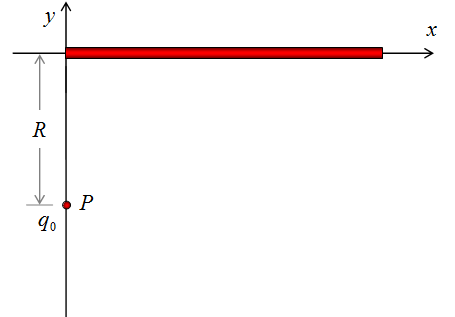 Una varilla aislante “semi-infinita” transporta una carga constante por unidad de longitud λ. Demuestre que la fuerza eléctrica sobre una carga puntual q0 forma un ángulo de 45° con ella y que este resultado no depende de la distancia R.