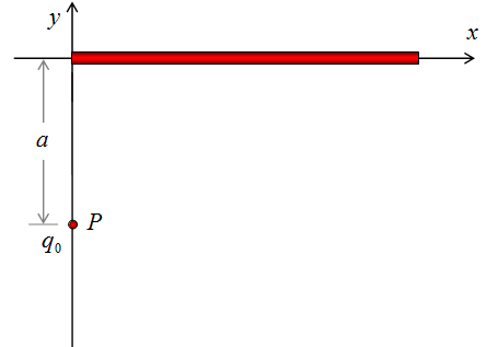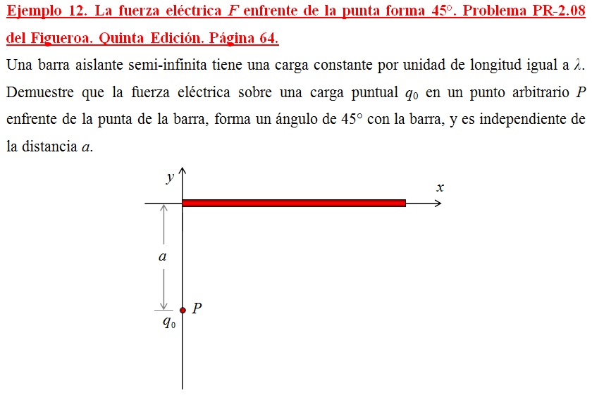 Una barra aislante semi-infinita tiene una carga constante por unidad de longitud igual a λ. Demuestre que la fuerza eléctrica sobre una carga puntual q0 en un punto arbitrario P enfrente de la punta de la barra, forma un ángulo de 45° con la barra, y es independiente de la distancia a.