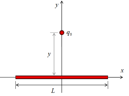 La figura muestra una delgada varilla de longitud L que se halla sobre el eje x y que tiene una carga positiva q, distribuida uniformemente de modo que la densidad lineal de carga es \( \displaystyle \lambda = \frac{q}{L}\). Calcular la fuerza que la varilla ejerce sobre la carga puntual positiva q0 ubicada en la bisectriz perpendicular de la varilla (el eje positivo y), a una distancia y de su centro.
