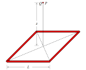 Una carga lineal de densidad tiene la forma de un cuadrado de lado L que está contenido en el plano x y y tiene su centro en el origen. Hallar la fuerza que este alambre ejerce sobre la carga Q situada a una distancia z sobre el eje.