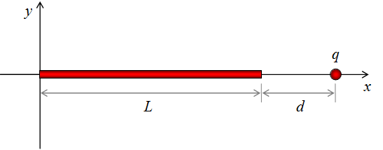 Obtenga la fuerza que actúa sobre una carga puntual positiva q situada a una distancia x del extremo de una varilla de longitud L, con una carga positiva Q distribuida uniformemente.