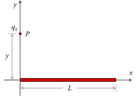 Una varilla de longitud L localizada a lo largo del eje de las x tiene una carga total Q y una densidad de carga lineal λ. a) Determine la fuerza eléctrica sobre una carga puntual positiva q0 situada en el punto P localizado en el eje de las y, a una distancia y del origen. b) Demostrar que el resultado que se obtiene de la parte a) es \( \displaystyle F = k\frac{q_0\,Q}{y^2}\) para y >> L. Explicar el resultado, c) Analice el caso si la barra es infinitamente larga (L → ∞).