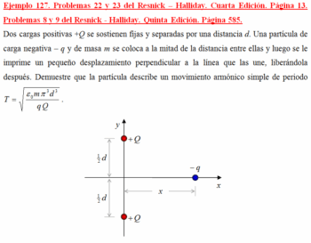 Dos cargas positivas +Q se sostienen fijas y separadas por una distancia d. Una partícula de carga negativa – q y de masa m se coloca a la mitad de la distancia entre ellas y luego se le imprime un pequeño desplazamiento perpendicular a la línea que las une, liberándola después. Demuestre que la partícula describe un movimiento armónico simple de periodo