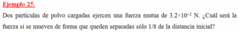 Dos partículas de polvo cargadas ejercen una fuerza mutua de 3.2×10–2 N. ¿Cuál será la fuerza si se mueven de forma que queden separadas sólo 1/8 de la distancia inicial?