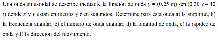 Una onda sinusoidal se describe mediante la función de onda y = (0.25 m) sen (0.30 x – 40 t) donde x y y están en metros y t en segundos. Determine para esta onda a) la amplitud, b) la frecuencia angular, c) el número de onda angular, d) la longitud de onda, e) la rapidez de onda y f) la dirección del movimiento.