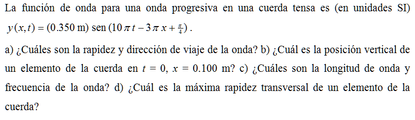 La función de onda para una onda progresiva en una cuerda tensa es (en unidades SI) \( \displaystyle y\,(x,t)=(0.350\,\text{m})\,\sin\,(10\,\pi\,t-3\,\pi\,x+\pi/4) \).