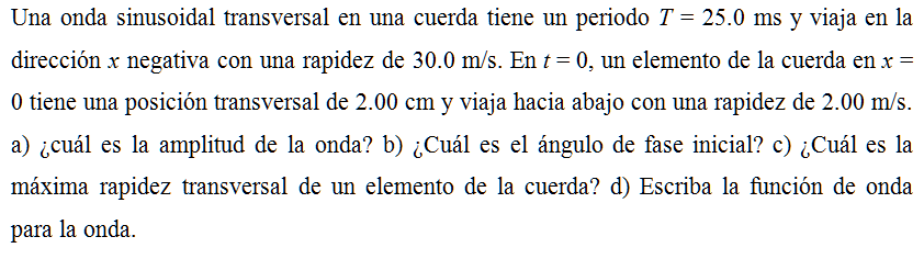 Una onda sinusoidal transversal en una cuerda tiene un periodo T = 25.0 ms y viaja en la dirección x negativa con una rapidez de 30.0 m/s. En t = 0, un elemento de la cuerda en x = 0 tiene una posición transversal de 2.00 cm y viaja hacia abajo con una rapidez de 2.00 m/s. a) ¿cuál es la amplitud de la onda? b) ¿Cuál es el ángulo de fase inicial? c) ¿Cuál es la máxima rapidez transversal de un elemento de la cuerda? d) Escriba la función de onda para la onda.