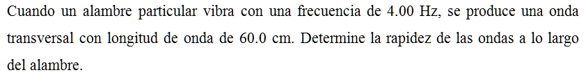 Cuando un alambre particular vibra con una frecuencia de 4.00 Hz, se produce una onda transversal con longitud de onda de 60.0 cm. Determine la rapidez de las ondas a lo largo del alambre.