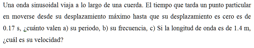 Una onda sinusoidal viaja a lo largo de una cuerda. El tiempo que tarda un punto particular en moverse desde su desplazamiento máximo hasta que su desplazamiento es cero es de 0.17 s, ¿cuánto valen a) su periodo, b) su frecuencia, c) Si la longitud de onda es de 1.4 m, ¿cuál es su velocidad?