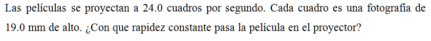 Las películas se proyectan a 24.0 cuadros por segundo. Cada cuadro es una fotografía de 19.0 mm de alto. ¿Con que rapidez constante pasa la película en el proyector?