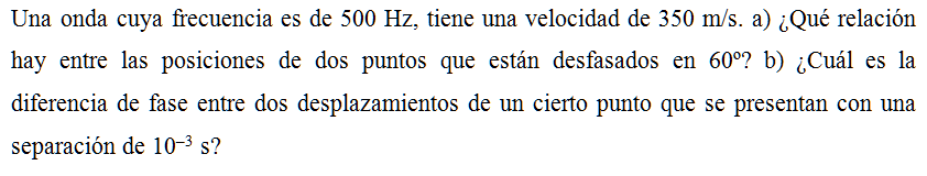 Una onda cuya frecuencia es de 500 Hz, tiene una velocidad de 350 m/s. a) ¿Qué relación hay entre las posiciones de dos puntos que están desfasados en 60º? b) ¿Cuál es la diferencia de fase entre dos desplazamientos de un cierto punto que se presentan con una separación de 10–3 s?