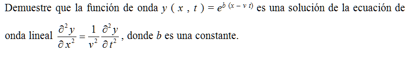 Demuestre que la función de onda y ( x , t ) = eb (x – v t) es una solución de la ecuación de onda lineal \( \displaystyle \frac{\partial^2y}{\partial\,x^2}=\frac{1}{v^2}\frac{\partial^2y}{\partial\,t^2}\), donde b es una constante.