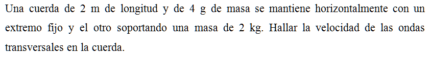 Una cuerda de 2 m de longitud y de 4 g de masa se mantiene horizontalmente con un extremo fijo y el otro soportando una masa de 2 kg. Hallar la velocidad de las ondas transversales en la cuerda.