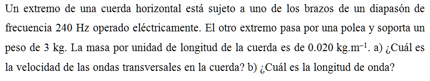 Un extremo de una cuerda horizontal está sujeto a uno de los brazos de un diapasón de frecuencia 240 Hz operado eléctricamente. El otro extremo pasa por una polea y soporta un peso de 3 kg. La masa por unidad de longitud de la cuerda es de 0.020 kg.m–1. a) ¿Cuál es la velocidad de las ondas transversales en la cuerda? b) ¿Cuál es la longitud de onda?