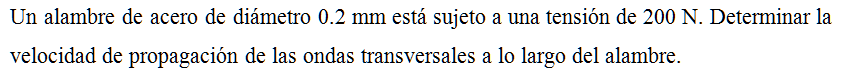 Un alambre de acero de diámetro 0.2 mm está sujeto a una tensión de 200 N. Determinar la velocidad de propagación de las ondas transversales a lo largo del alambre.