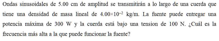 Ondas sinusoidales de 5.00 cm de amplitud se transmitirán a lo largo de una cuerda que tiene una densidad de masa lineal de 4.00×10–2 kg/m. La fuente puede entregar una potencia máxima de 300 W y la cuerda está bajo una tension de 100 N. ¿Cuál es la frecuencia más alta a la que puede funcionar la fuente?