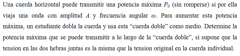 Una cuerda horizontal puede transmitir una potencia máxima P0 (sin romperse) si por ella viaja una onda con amplitud A y frecuencia angular ω. Para aumentar esta potencia máxima, un estudiante dobla la cuerda y usa esta “cuerda doble” como medio. Determine la potencia máxima que se puede transmitir a lo largo de la “cuerda doble”, si supone que la tension en las dos hebras juntas es la misma que la tension original en la cuerda individual.