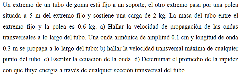 Un extremo de un tubo de goma está fijo a un soporte, el otro extremo pasa por una polea situada a 5 m del extremo fijo y sostiene una carga de 2 kg. La masa del tubo entre el extremo fijo y la polea es 0.6 kg. a) Hallar la velocidad de propagación de las ondas transversales a lo largo del tubo. Una onda armónica de amplitud 0.1 cm y longitud de onda 0.3 m se propaga a lo largo del tubo; b) hallar la velocidad transversal máxima de cualquier punto del tubo. c) Escribir la ecuación de la onda. d) Determinar el promedio de la rapidez con que fluye energía a través de cualquier sección transversal del tubo.