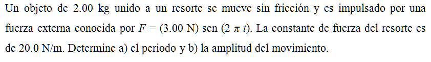 Un objeto de 2.00 kg unido a un resorte se mueve sin fricción y es impulsado por una fuerza externa conocida por F = (3.00 N) sen (2 π t). La constante de fuerza del resorte es de 20.0 N/m. Determine a) el periodo y b) la amplitud del movimiento.