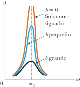 Grafica de amplitud en función de la frecuencia para un oscilador amortiguado cuando esta presente una fuerza impulsora periódica. Cuando la frecuencia ω de la fuerza impulsora es igual a la frecuencia natural ω0 del oscilador, presenta resonancia. Advierta que la forma de la curva de resonancia depende del tamaño del coeficiente de amortiguamiento b.